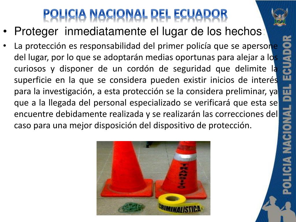 POLICIA NACIONAL DEL ECUADOR • Proteger inmediatamente el lugar de los hechos: • La protección es responsabilidad del primer policía que se apersone del lugar, por lo que se adoptarán medias oportunas para alejar a los curiosos y disponer de un cordón de seguridad que delimite la superficie en la que se considera pueden existir inicios de interés para la investigación, a esta protección se la considera preliminar, ya que a la llegada del personal especializado se verificará que esta se encuentre debidamente realizada y se realizarán las correcciones del caso para una mejor disposición del dispositivo de protección.