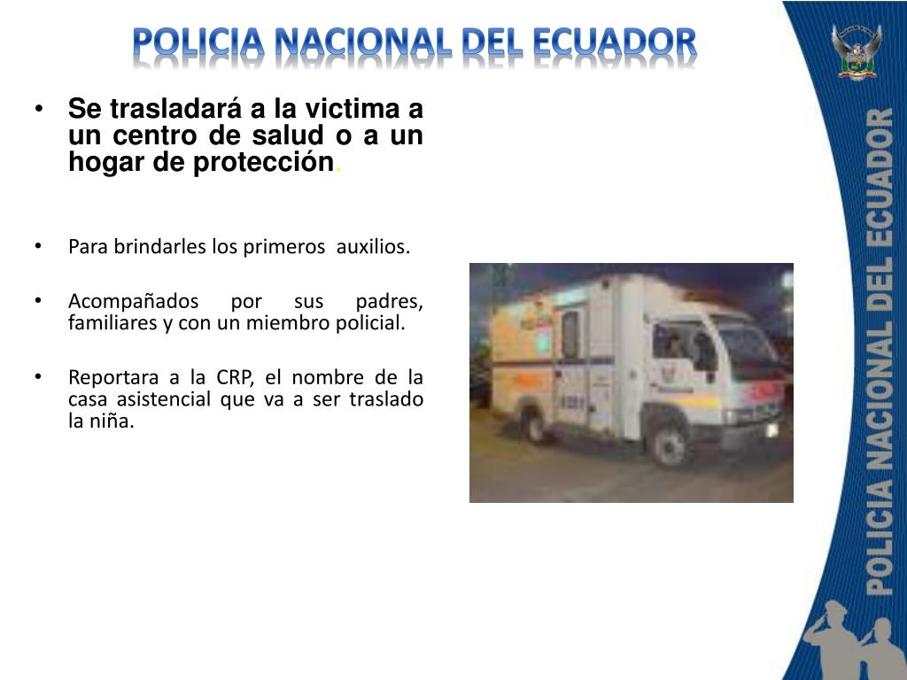 POLICIA NACIONAL DEL ECUADOR • Se trasladará a la victima a un centro de salud o a un hogar de protección. • Para brindarles los primeros auxilios. • Acompañados por sus padres, familiares y con un miembro policial. • Reportara a la CRP, el nombre de la casa asistencial que va a ser traslado la niña.