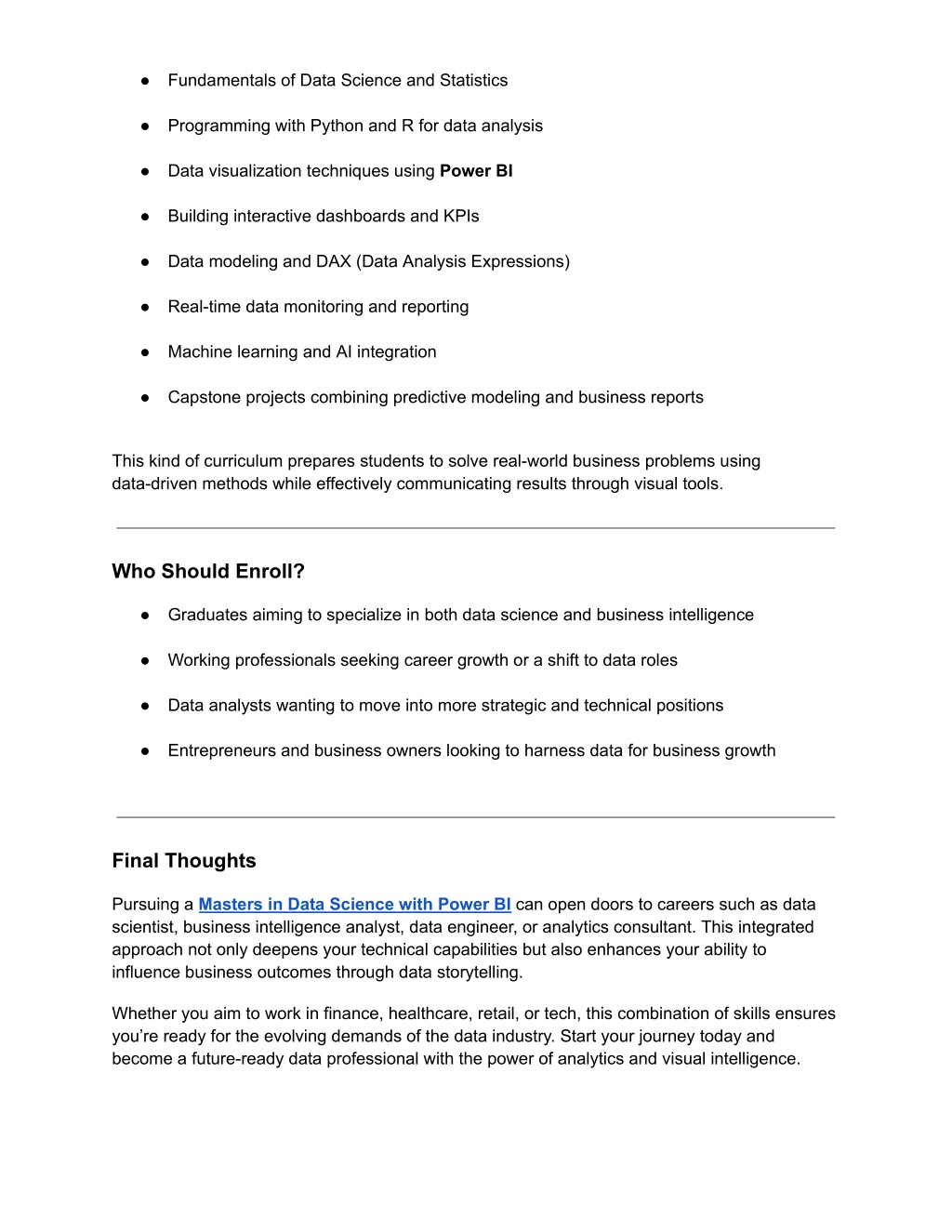 2. ● Fundamentals of Data Science and Statistics ● Programming with Python and R for data analysis ● Data visualization techniques using Power BI ● Building interactive dashboards and KPIs ● Data modeling and DAX (Data Analysis Expressions) ● Real-time data monitoring and reporting ● Machine learning and AI integration ● Capstone projects combining predictive modeling and business reports This kind of curriculum prepares students to solve real-world business problems using data-driven methods while effectively communicating results through visual tools. Who Should Enroll? ● Graduates aiming to specialize in both data science and business intelligence ● Working professionals seeking career growth or a shift to data roles ● Data analysts wanting to move into more strategic and technical positions ● Entrepreneurs and business owners looking to harness data for business growth Final Thoughts Pursuing a Masters in Data Science with Power BI can open doors to careers such as data scientist, business intelligence analyst, data engineer, or analytics consultant. This integrated approach not only deepens your technical capabilities but also enhances your ability to influence business outcomes through data storytelling. Whether you aim to work in finance, healthcare, retail, or tech, this combination of skills ensures you’re ready for the evolving demands of the data industry. Start your journey today and become a future-ready data professional with the power of analytics and visual intelligence.
