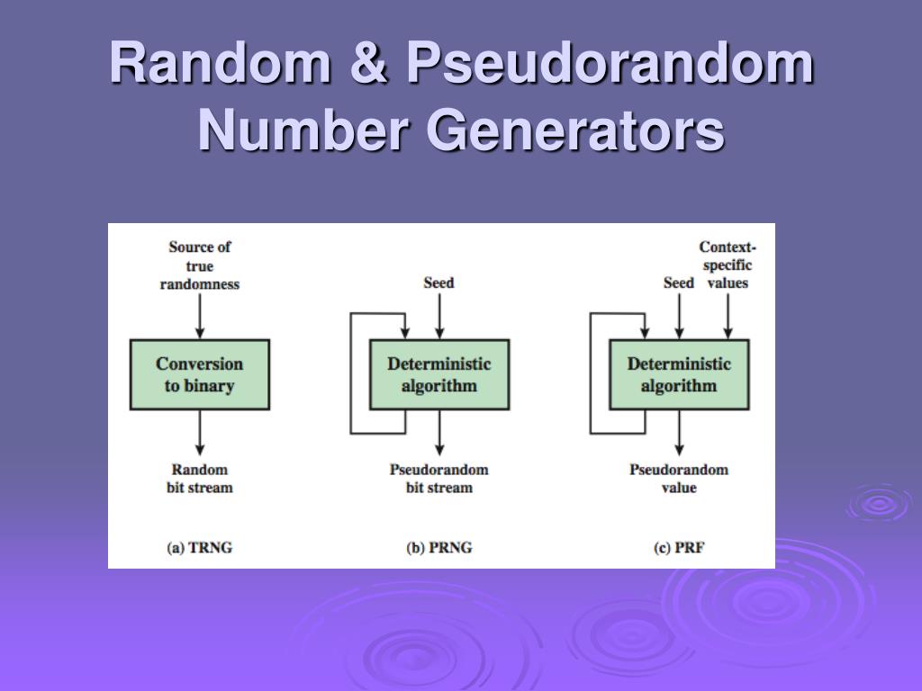Pseudorandom Number Generators (PRNGs) • often use deterministic algorithmic techniques to create “random numbers” • although are not truly random • can pass many tests of “randomness” • known as “pseudorandom numbers” • created by “Pseudorandom Number Generators (PRNGs)”