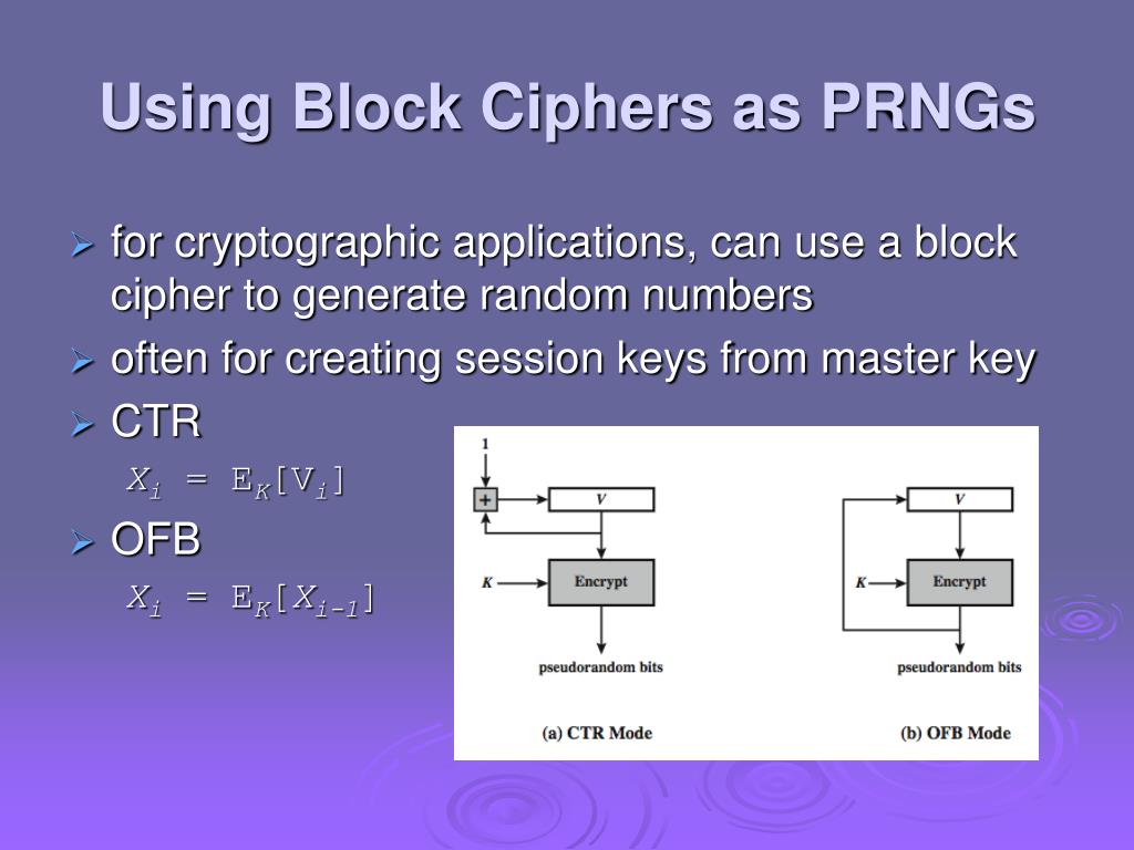 Using Block Ciphers as PRNGs • for cryptographic applications, can use a block cipher to generate random numbers • often for creating session keys from master key • CTR Xi = EK[Vi] • OFB Xi = EK[Xi-1]