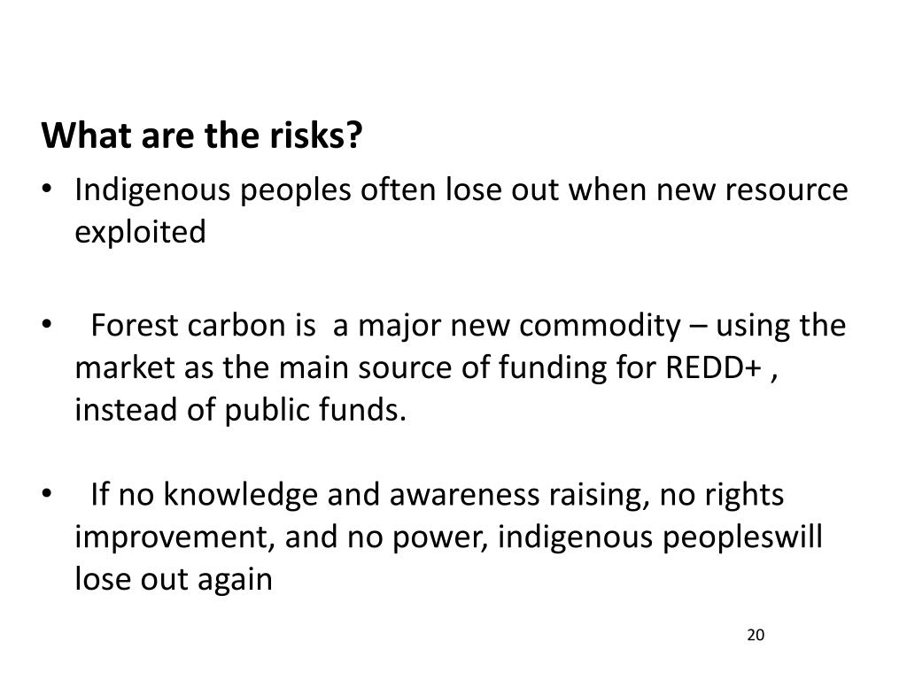 What are the risks? • Indigenous peoples often lose out when new resource exploited • Forest carbon is a major new commodity – using the market as the main source of funding for REDD+ , instead of public funds. • If no knowledge and awareness raising, no rights improvement, and no power, indigenous peopleswill lose out again 20