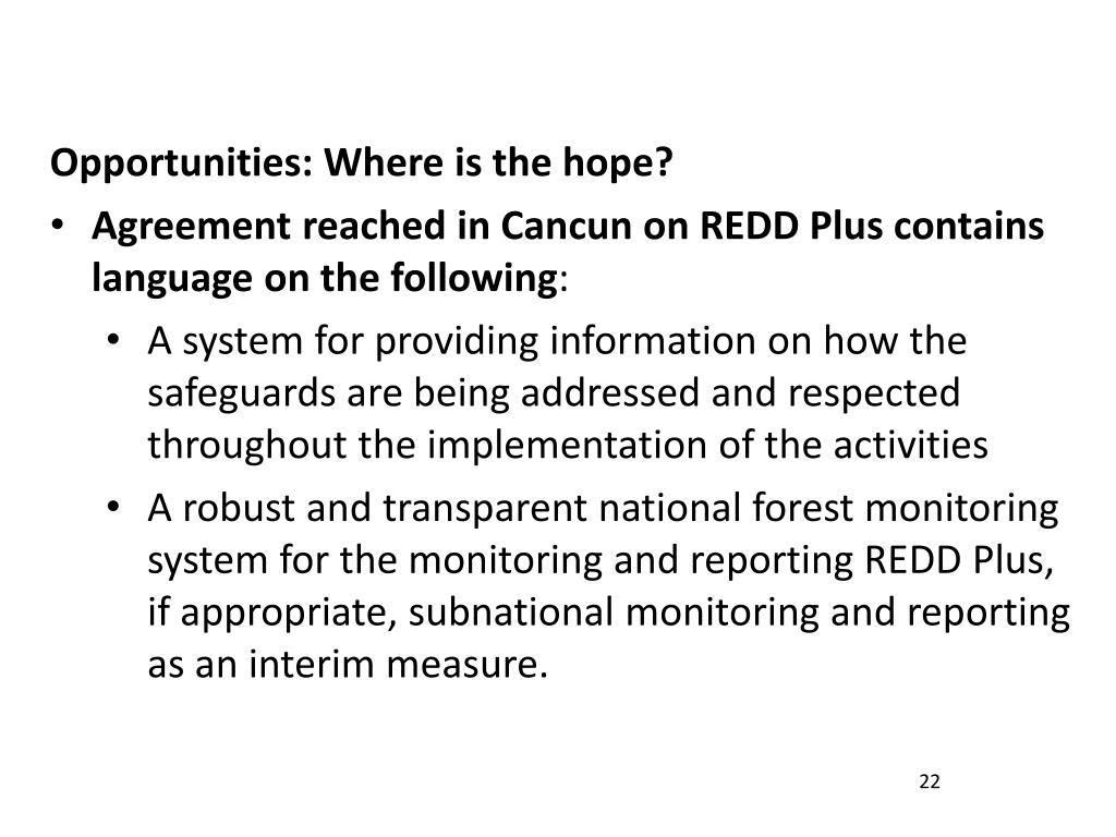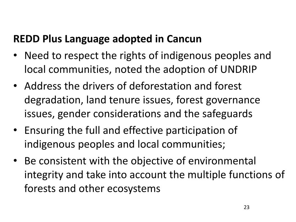 Opportunities: Where is the hope? • Agreement reached in Cancun on REDD Plus contains language on the following: • A system for providing information on how the safeguards are being addressed and respected throughout the implementation of the activities • A robust and transparent national forest monitoring system for the monitoring and reporting REDD Plus, if appropriate, subnational monitoring and reporting as an interim measure. 22