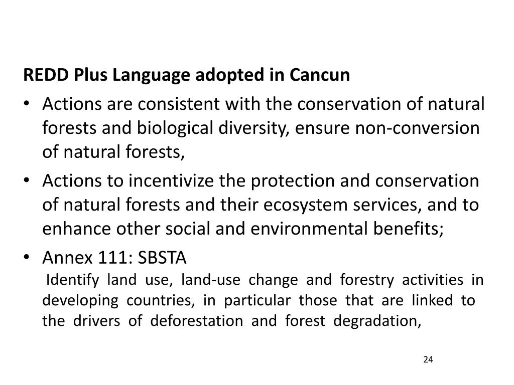 REDD Plus Language adopted in Cancun • Need to respect the rights of indigenous peoples and local communities, noted the adoption of UNDRIP • Address the drivers of deforestation and forest degradation, land tenure issues, forest governance issues, gender considerations and the safeguards • Ensuring the full and effective participation of indigenous peoples and local communities; • Be consistent with the objective of environmental integrity and take into account the multiple functions of forests and other ecosystems 23