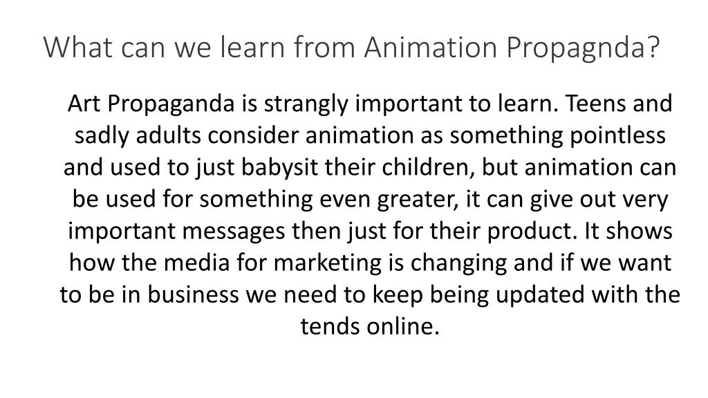 What can we learn from Animation Propagnda? Art Propaganda is strangly important to learn. Teens and sadly adults consider animation as something pointless and used to just babysit their children, but animation can be used for something even greater, it can give out very important messages then just for their product. It shows how the media for marketing is changing and if we want to be in business we need to keep being updated with the tends online.