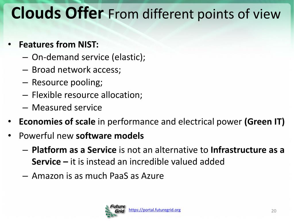 Clouds Offer From different points of view • Features from NIST: • On-demand service (elastic); • Broad network access; • Resource pooling; • Flexible resource allocation; • Measured service • Economies of scale in performance and electrical power (Green IT) • Powerful new software models • Platform as a Service is not an alternative to Infrastructure as a Service – it is instead an incredible valued added • Amazon is as much PaaS as Azure