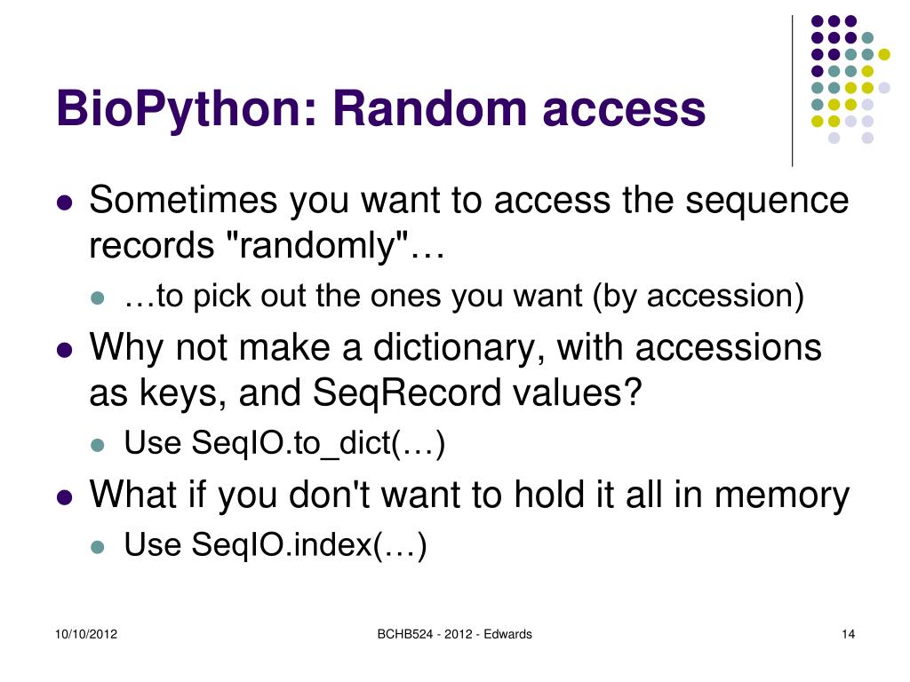 BioPython: Random access • Sometimes you want to access the sequence records "randomly"… • …to pick out the ones you want (by accession) • Why not make a dictionary, with accessions as keys, and SeqRecord values? • Use SeqIO.to_dict(…) • What if you don't want to hold it all in memory • Use SeqIO.index(…) BCHB524 - 2012 - Edwards
