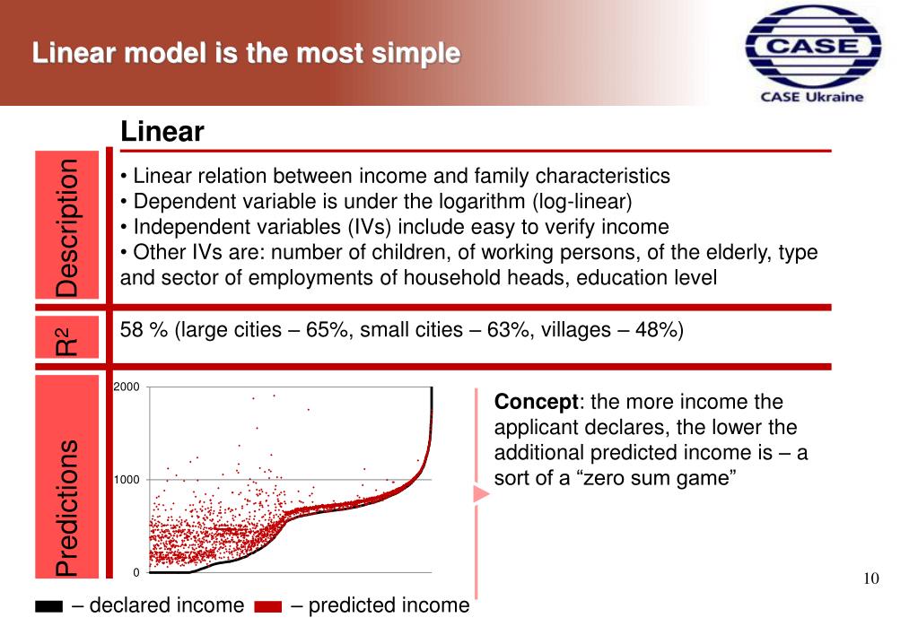 Linear model is the most simple Linear • Linear relation between income and family characteristics • Dependent variable is under the logarithm (log-linear) • Independent variables (IVs) include easy to verify income • Other IVs are: number of children, of working persons, of the elderly, type and sector of employments of household heads, education level Description R2 58 % (large cities – 65%, small cities – 63%, villages – 48%) Concept: the more income the applicant declares, the lower the additional predicted income is – a sort of a “zero sum game” Predictions – declared income – predicted income 10
