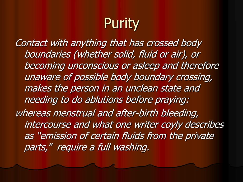 Purity Contact with anything that has crossed body boundaries (whether solid, fluid or air), or becoming unconscious or asleep and therefore unaware of possible body boundary crossing, makes the person in an unclean state and needing to do ablutions before praying: whereas menstrual and after-birth bleeding, intercourse and what one writer coyly describes as “emission of certain fluids from the private parts,” require a full washing.
