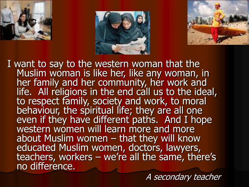 I want to say to the western woman that the Muslim woman is like her, like any woman, in her family and her community, her work and life. All religions in the end call us to the ideal, to respect family, society and work, to moral behaviour, the spiritual life; they are all one even if they have different paths. And I hope western women will learn more and more about Muslim women – that they will know educated Muslim women, doctors, lawyers, teachers, workers – we’re all the same, there’s no difference. A secondary teacher