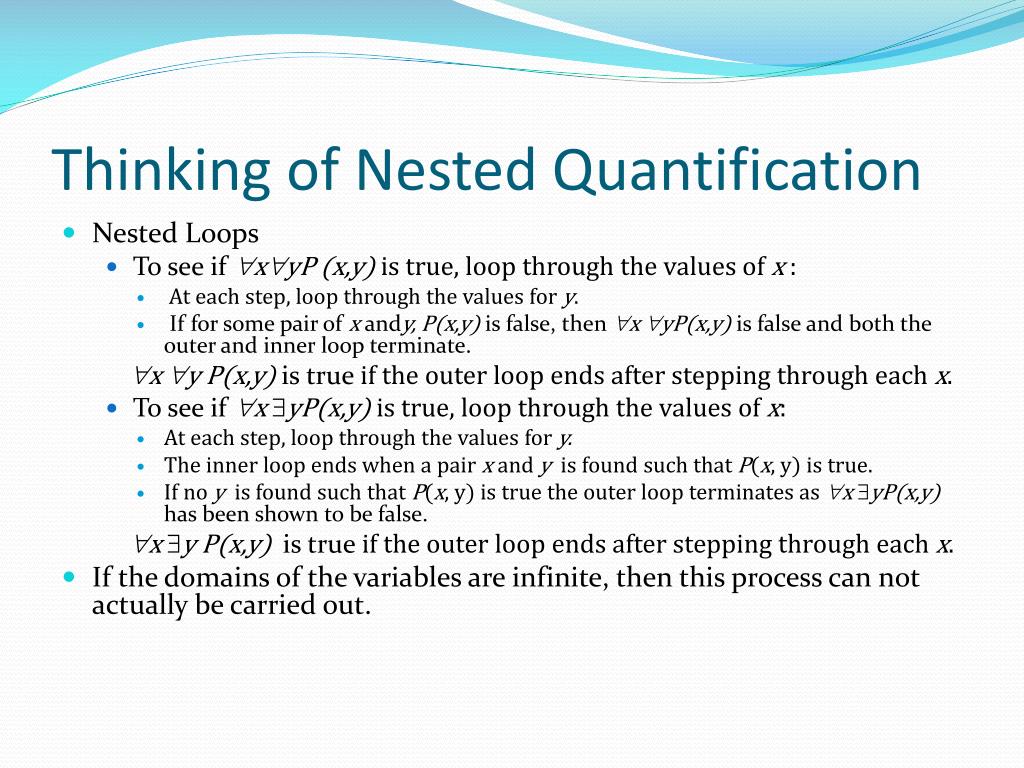 Thinking of Nested Quantification • Nested Loops • To see if xyP (x,y) is true, loop through the values of x : • At each step, loop through the values for y. • If for some pair of x andy, P(x,y) is false, then x yP(x,y) is false and both the outer and inner loop terminate. x y P(x,y) is trueif the outer loop ends after stepping through each x. • To see if x yP(x,y) is true, loop through the values of x: • At each step, loop through the values for y. • The inner loop ends when a pair x and y is found such that P(x, y) is true. • If no y is found such that P(x, y) is true the outer loop terminates as x yP(x,y) has been shown to be false. x y P(x,y) is trueif the outer loop ends after stepping through each x. • If the domains of the variables are infinite, then this process can not actually be carried out.