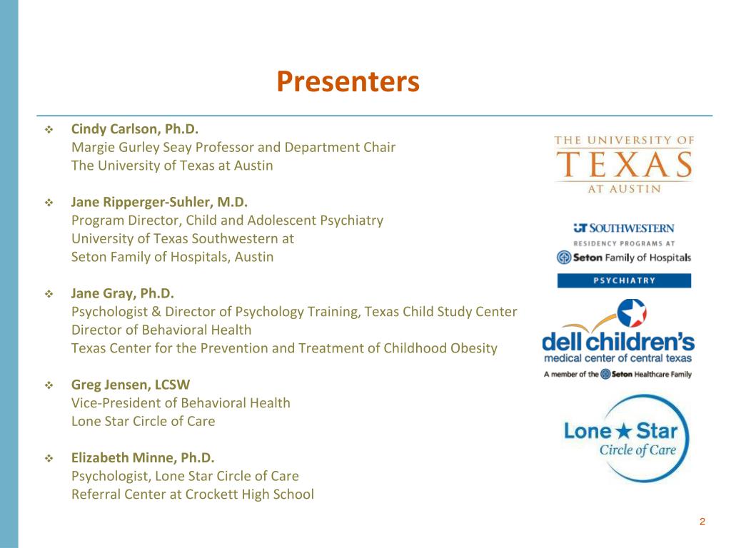 Presenters Cindy Carlson, Ph.D. Margie Gurley Seay Professor and Department Chair The University of Texas at Austin Jane Ripperger-Suhler, M.D. Program Director, Child and Adolescent Psychiatry University of Texas Southwestern at Seton Family of Hospitals, Austin Jane Gray, Ph.D. Psychologist & Director of Psychology Training, Texas Child Study Center Director of Behavioral Health Texas Center for the Prevention and Treatment of Childhood Obesity Greg Jensen, LCSW Vice-President of Behavioral Health Lone Star Circle of Care Elizabeth Minne, Ph.D. Psychologist, Lone Star Circle of Care Referral Center at Crockett High School