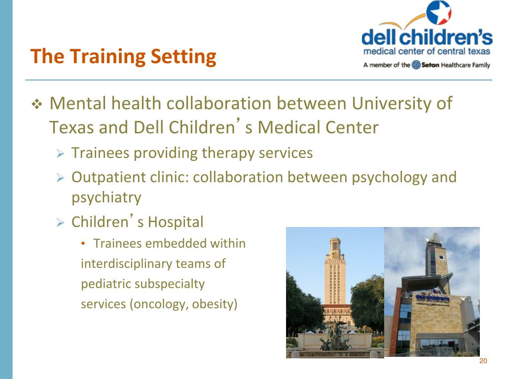 The Training Setting • Mental health collaboration between University of Texas and Dell Children’s Medical Center • Trainees providing therapy services • Outpatient clinic: collaboration between psychology and psychiatry • Children’s Hospital • Trainees embedded within interdisciplinary teams of pediatric subspecialty services (oncology, obesity)