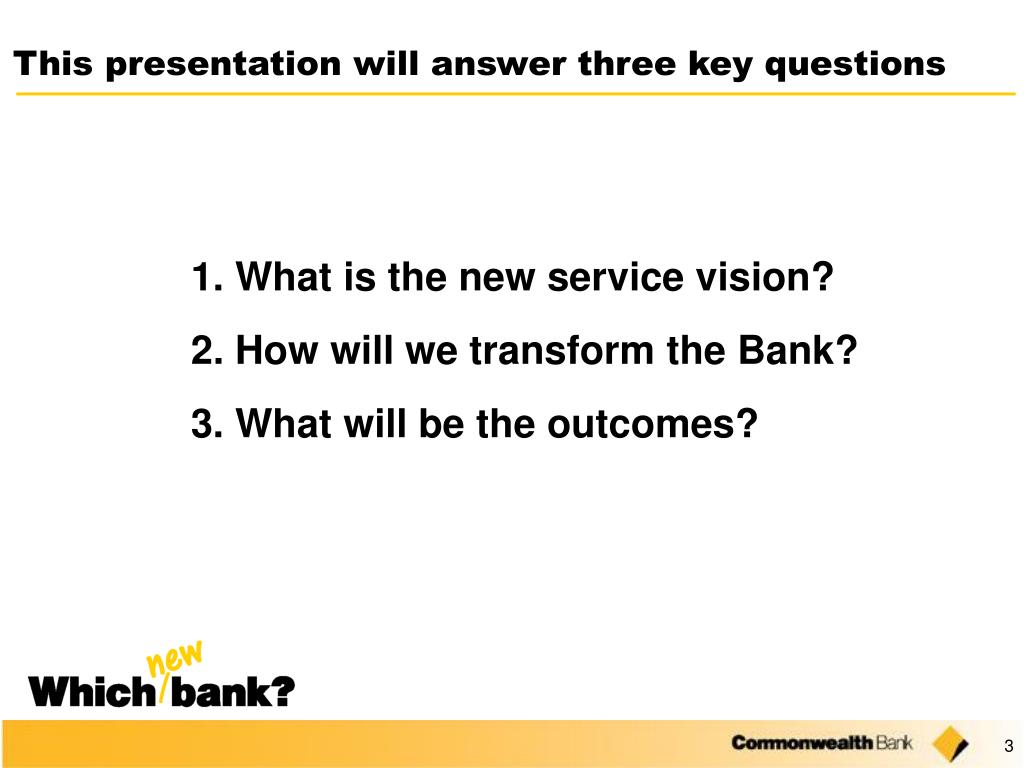 This presentation will answer three key questions 1. What is the new service vision? 2.How will we transform the Bank? 3. What will be the outcomes?