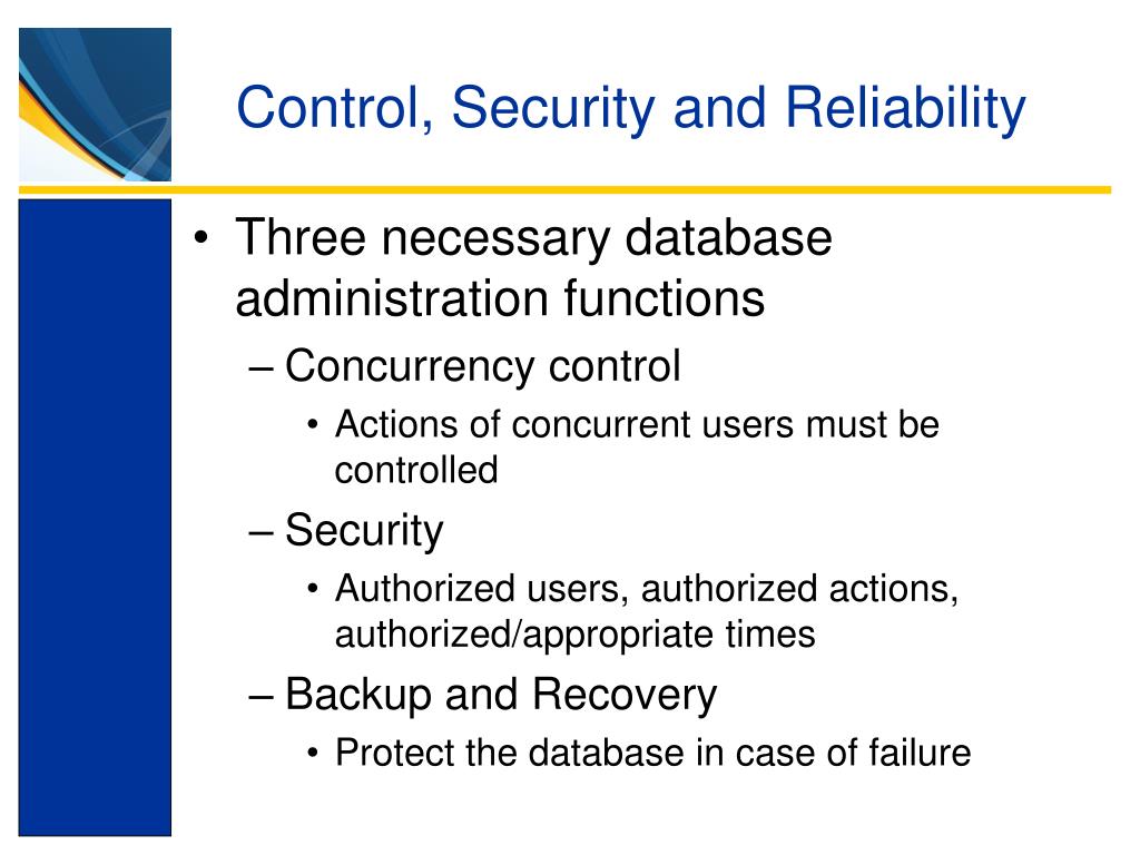 Control, Security and Reliability • Three necessary database administration functions • Concurrency control • Actions of concurrent users must be controlled • Security • Authorized users, authorized actions, authorized/appropriate times • Backup and Recovery • Protect the database in case of failure
