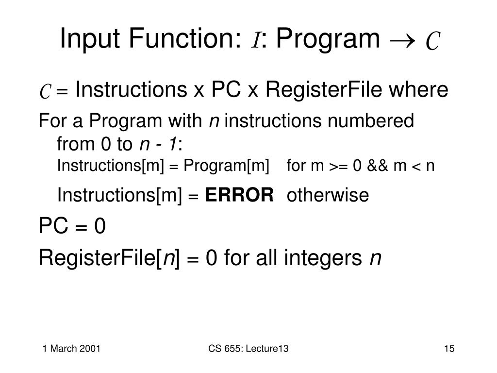Input Function: I: Program C C = Instructions x PC x RegisterFile where For a Program with n instructions numbered from 0 to n - 1:Instructions[m] = Program[m] for m >= 0 && m < n Instructions[m] = ERROR otherwise PC = 0 RegisterFile[n] = 0 for all integers n CS 655: Lecture13