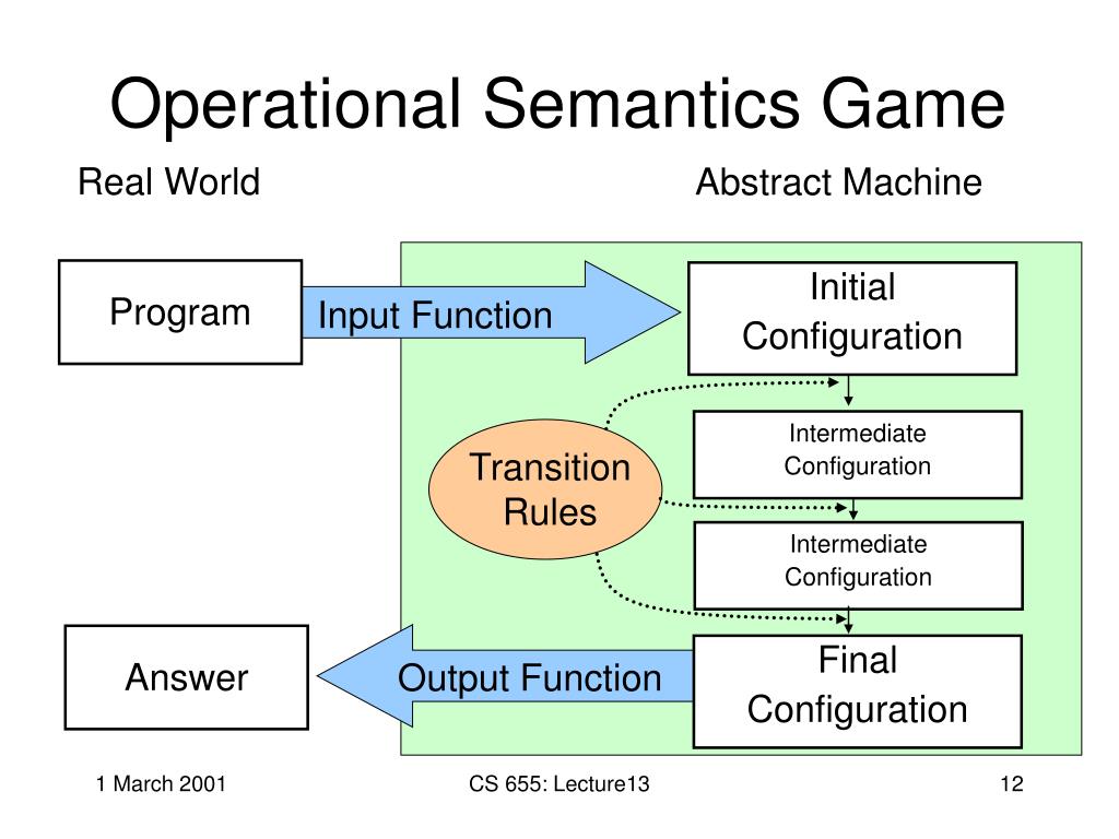 Operational Semantics Game Real World Abstract Machine Program Initial Configuration Input Function Intermediate Configuration Transition Rules Intermediate Configuration Answer Final Configuration Output Function CS 655: Lecture13