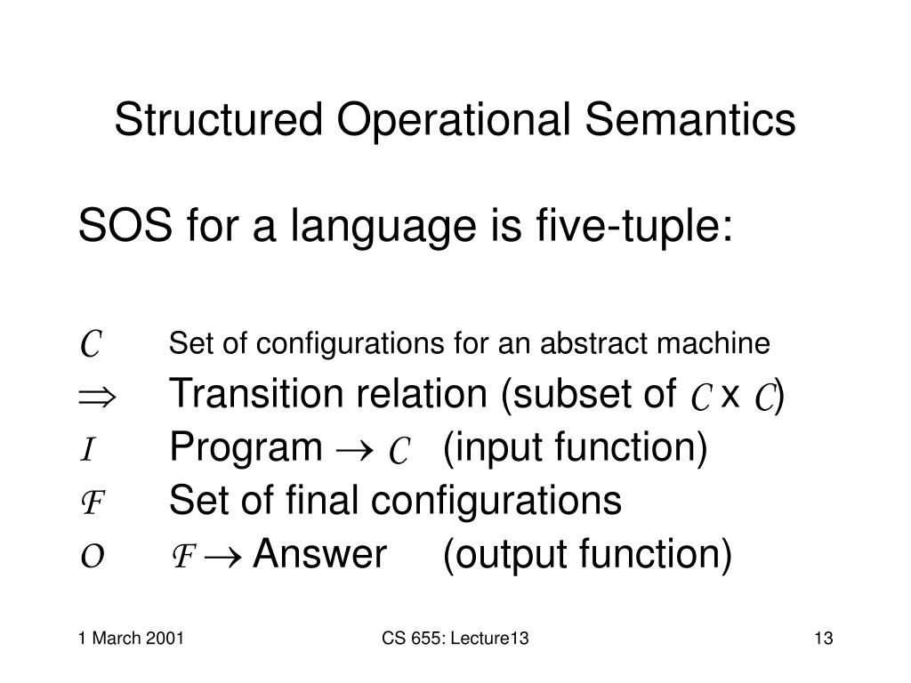 Structured Operational Semantics SOS for a language is five-tuple: CSet of configurations for an abstract machine Transition relation (subset of C x C) I Program C (input function) F Set of final configurations OF Answer (output function) CS 655: Lecture13