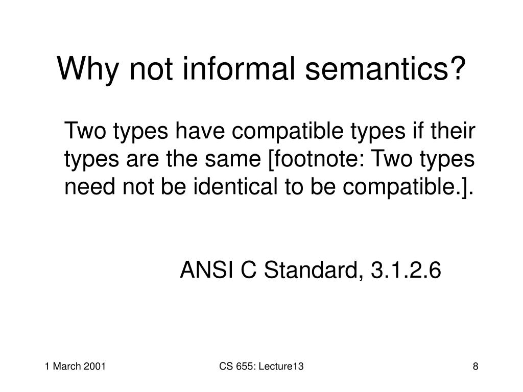 Why not informal semantics? Two types have compatible types if their types are the same [footnote: Two types need not be identical to be compatible.]. ANSI C Standard, 3.1.2.6 CS 655: Lecture13