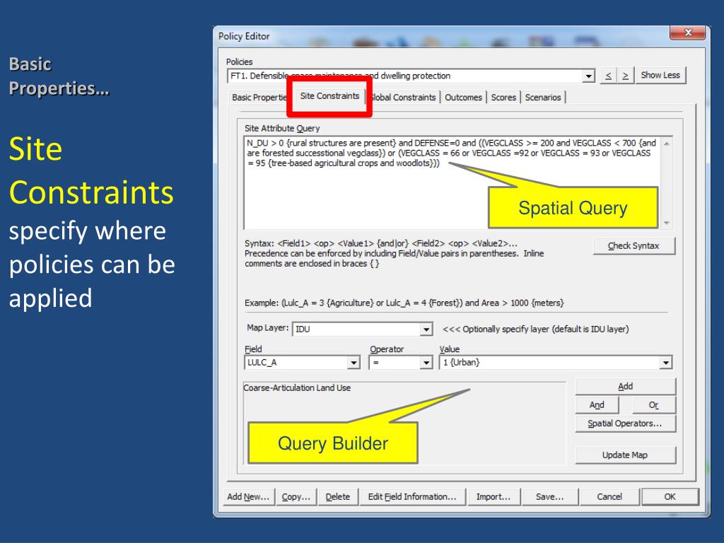 Site Constraintsspecify where policies can be applied BasicProperties… Spatial Query Query Builder