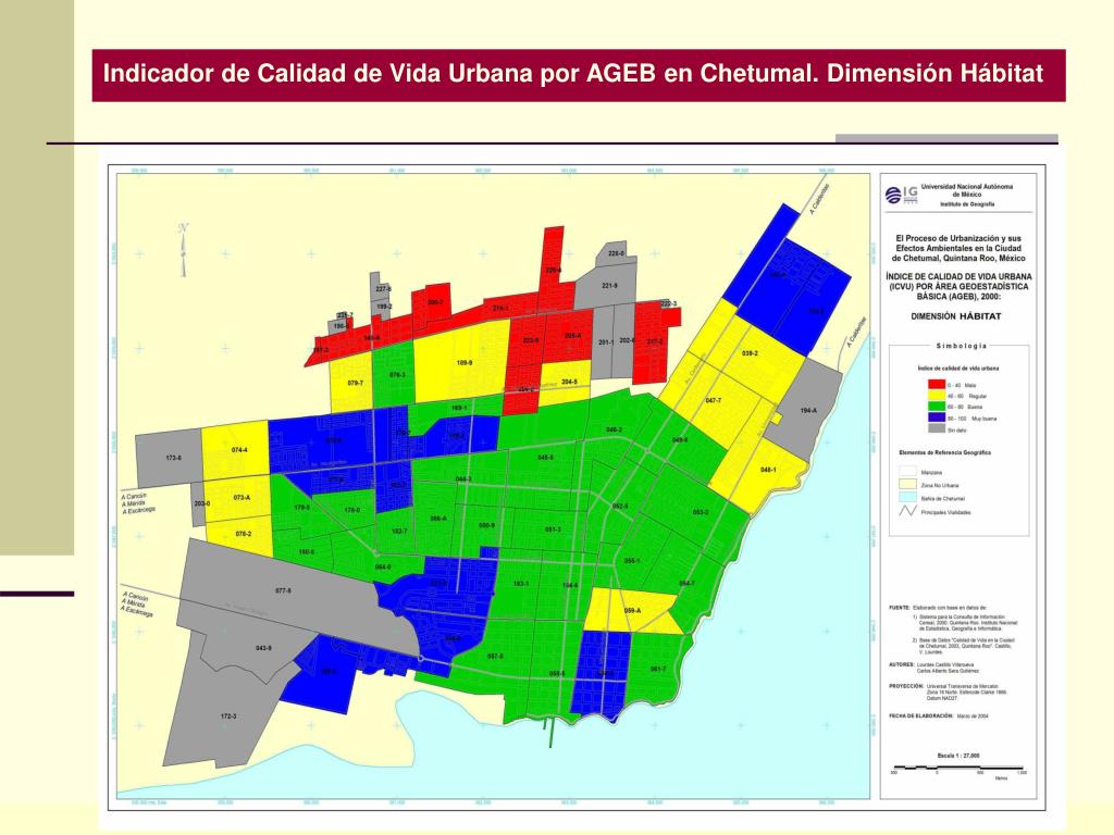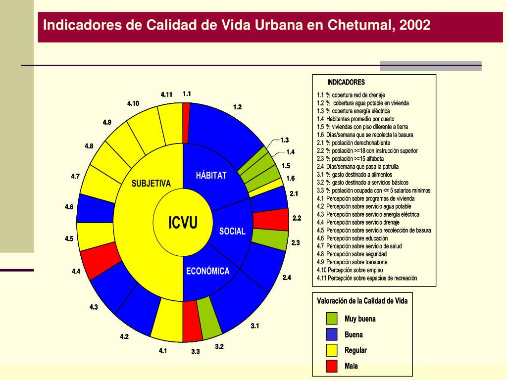 Indicador de calidad de vida aplicado a Chetumal • Datos 2000 de INEGI. • Encuesta aplicada en 2002 a una muestra de 470 viviendas. • Se calcularon 24 indicadores simples, 4 indicadores (uno por dimensión) y un indicador general de calidad de vida urbana.