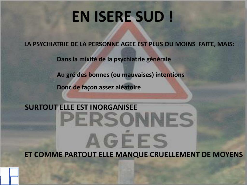 EN ISERE SUD ! LA PSYCHIATRIE DE LA PERSONNE AGEE EST PLUS OU MOINS FAITE, MAIS: Dans la mixité de la psychiatrie générale Au gré des bonnes (ou mauvaises) intentions Donc de façon assez aléatoire SURTOUT ELLE EST INORGANISEE ET COMME PARTOUT ELLE MANQUE CRUELLEMENT DE MOYENS