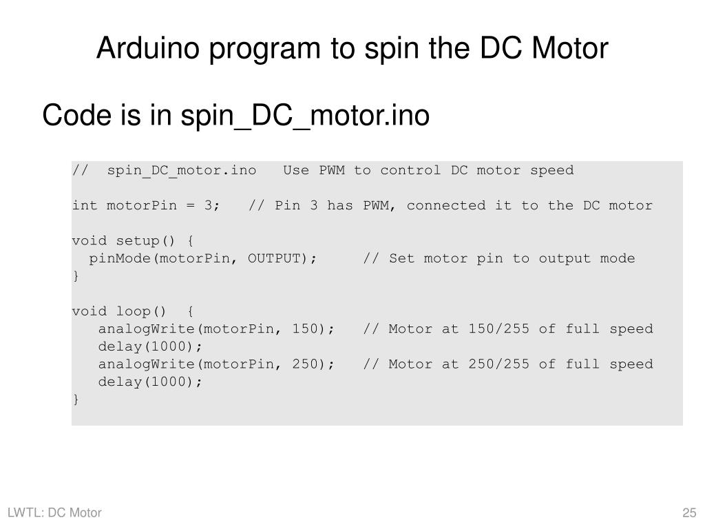 Arduino program to spin the DC Motor Code is in spin_DC_motor.ino • // spin_DC_motor.ino Use PWM to control DC motor speed • intmotorPin = 3; // Pin 3 has PWM, connected it to the DC motor • void setup(){ • pinMode(motorPin, OUTPUT); // Set motor pin to output mode • } • void loop(){ • analogWrite(motorPin, 150); // Motor at 150/255 of full speed • delay(1000); • analogWrite(motorPin, 250); // Motor at 250/255 of full speed • delay(1000); • }