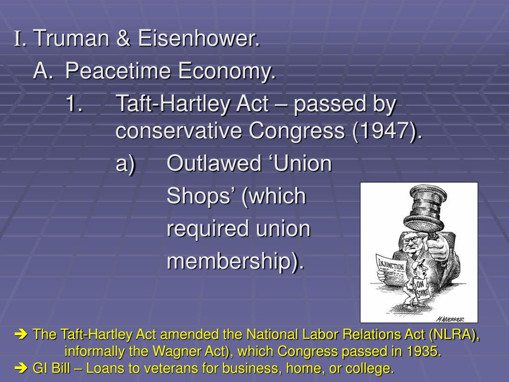 I. Truman & Eisenhower. A. Peacetime Economy. 1. Taft-Hartley Act – passed by conservative Congress (1947). a) Outlawed ‘Union Shops’ (which required union membership). • The Taft-Hartley Act amended the National Labor Relations Act (NLRA), informally the Wagner Act), which Congress passed in 1935. • GI Bill – Loans to veterans for business, home, or college.