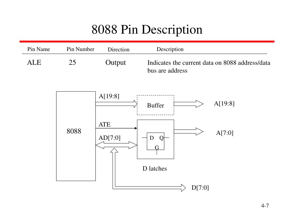 D Q G 8088 Pin Description Pin Name Pin Number Description Direction ALE 25 Output Indicates the current data on 8088 address/data bus are address A[19:8] Buffer A[19:8] ATE 8088 A[7:0] AD[7:0] D latches D[7:0]
