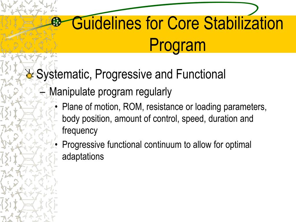 Guidelines for Core Stabilization Program • Systematic, Progressive and Functional • Manipulate program regularly • Plane of motion, ROM, resistance or loading parameters, body position, amount of control, speed, duration and frequency • Progressive functional continuum to allow for optimal adaptations
