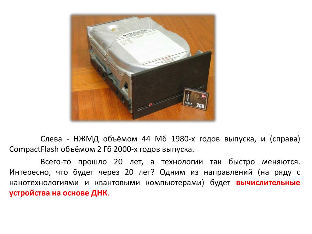 Биокомпьютеры ( DNA ( DeoxyriboNucleic Acid ) computing ). Слева - НЖМД объёмом 44 Мб 1980-х годов выпуска, и (справа) CompactFlash объёмом 2 Гб 2000-х годов выпуска.
