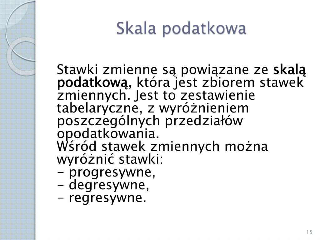 Skala podatkowa Stawki zmienne są powiązane ze skalą podatkową, która jest zbiorem stawek zmiennych. Jest to zestawienie tabelaryczne, z wyróżnieniem poszczególnych przedziałów opodatkowania.Wśród stawek zmiennych można wyróżnić stawki: - progresywne, - degresywne, - regresywne.