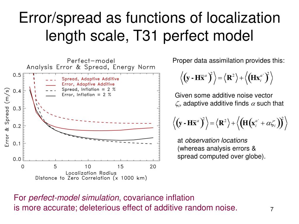 Error/spread as functions of localization length scale, T31 perfect model Proper data assimilation provides this: Given some additive noise vector i, adaptive additive finds such that at observation locations (whereas analysis errors & spread computed over globe). For perfect-model simulation, covariance inflation is more accurate; deleterious effect of additive random noise.