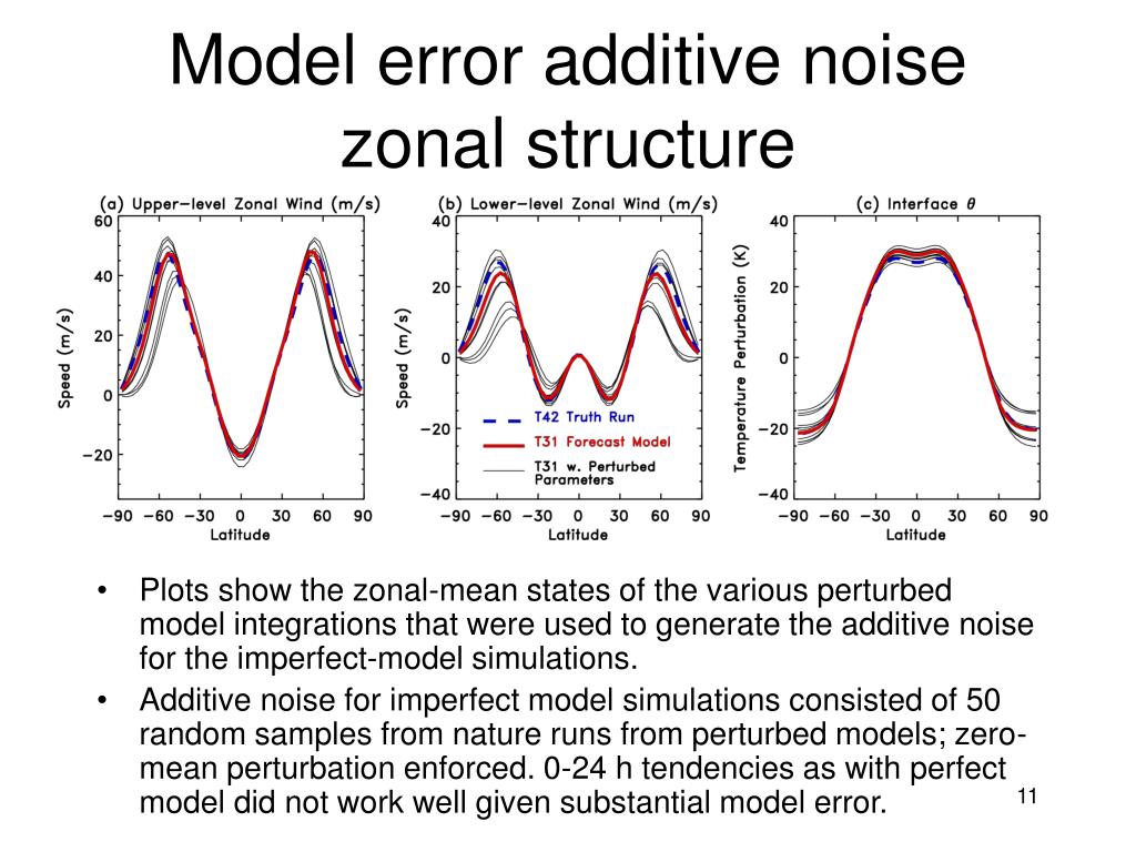 Model error additive noise zonal structure • Plots show the zonal-mean states of the various perturbed model integrations that were used to generate the additive noise for the imperfect-model simulations. • Additive noise for imperfect model simulations consisted of 50 random samples from nature runs from perturbed models; zero-mean perturbation enforced. 0-24 h tendencies as with perfect model did not work well given substantial model error.