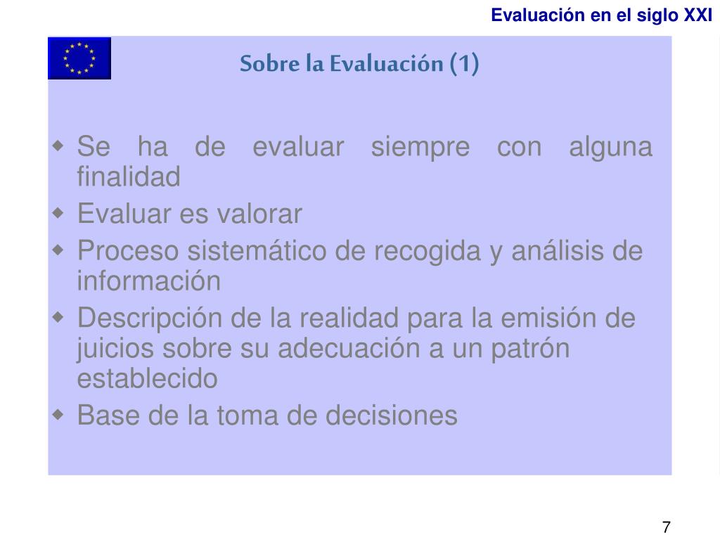 Se ha de evaluar siempre con alguna finalidad Evaluar es valorar Proceso sistemático de recogida y análisis de información Descripción de la realidad para la emisión de juicios sobre su adecuación a un patrón establecido Base de la toma de decisiones Evaluación en el siglo XXI Sobre la Evaluación (1)
