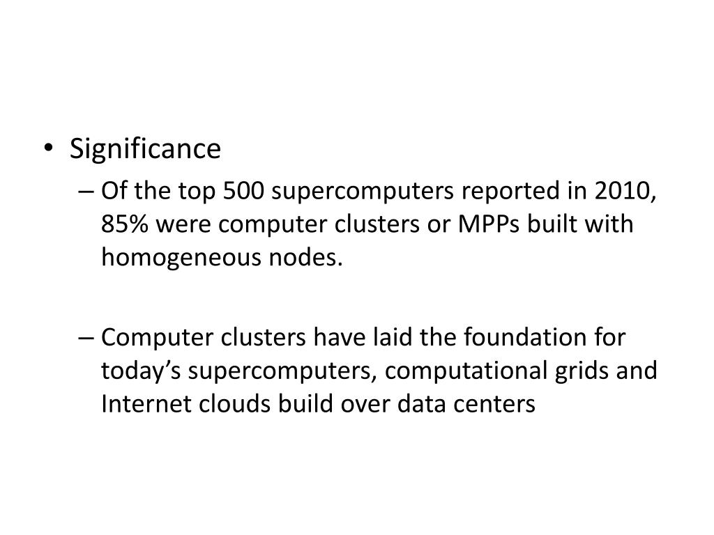 Significance • Of the top 500 supercomputers reported in 2010, 85% were computer clusters or MPPs built with homogeneous nodes. • Computer clusters have laid the foundation for today’s supercomputers, computational grids and Internet clouds build over data centers