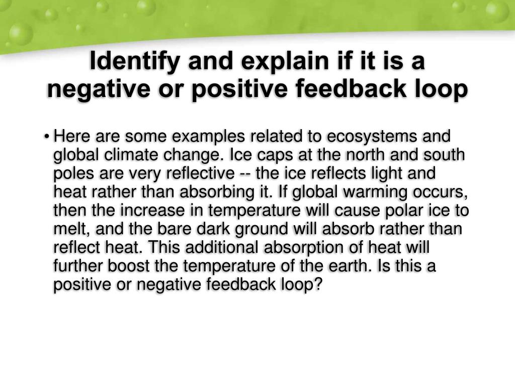Identify and explain if it is a negative or positive feedback loop • Here are some examples related to ecosystems and global climate change. Ice caps at the north and south poles are very reflective -- the ice reflects light and heat rather than absorbing it. If global warming occurs, then the increase in temperature will cause polar ice to melt, and the bare dark ground will absorb rather than reflect heat. This additional absorption of heat will further boost the temperature of the earth. Is this a positive or negative feedback loop?