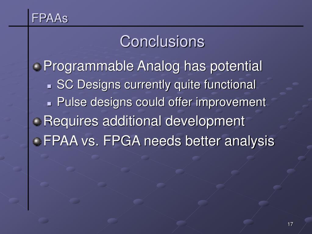 FPAAs Agenda • Why Use Programmable Analog • Switched Capacitors – Current Tech • Pulse Based – Current Research • Future of FPAAs • Conclusions