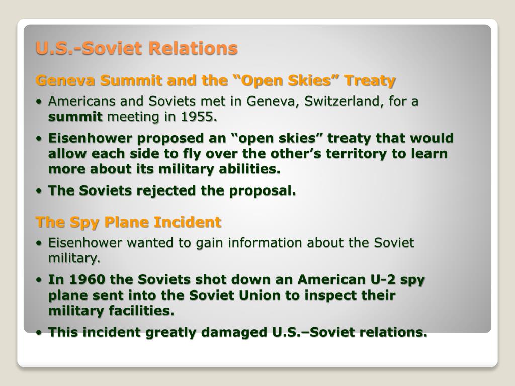 U.S.-Soviet Relations Geneva Summit and the “Open Skies” Treaty • Americans and Soviets met in Geneva, Switzerland, for a summit meeting in 1955. • Eisenhower proposed an “open skies” treaty that would allow each side to fly over the other’s territory to learn more about its military abilities. • The Soviets rejected the proposal. The Spy Plane Incident • Eisenhower wanted to gain information about the Soviet military. • In 1960 the Soviets shot down an American U-2 spy plane sent into the Soviet Union to inspect their military facilities. • This incident greatly damaged U.S.–Soviet relations.