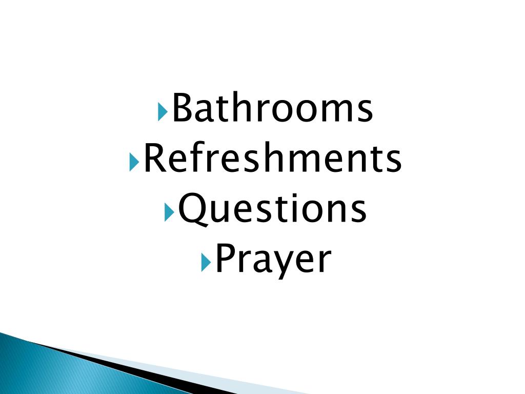 Bathrooms • Refreshments • Questions • Prayer