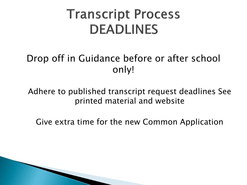 Transcript ProcessDEADLINES Drop off in Guidance before or after school only! Adhere to published transcript request deadlines See printed material and website Give extra time for the new Common Application
