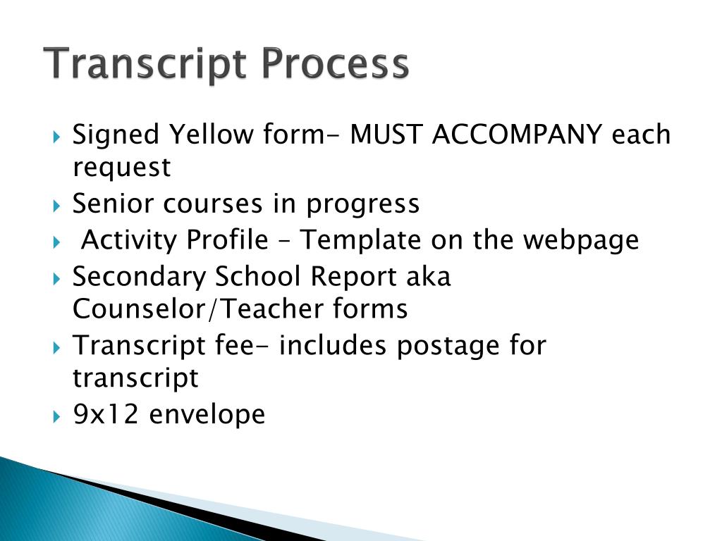 Transcript Process • Signed Yellow form- MUST ACCOMPANY each request • Senior courses in progress • Activity Profile – Template on the webpage • Secondary School Report aka Counselor/Teacher forms • Transcript fee- includes postage for transcript • 9x12 envelope