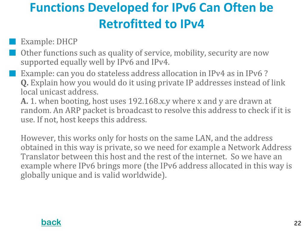 Functions Developed for IPv6 Can Often be Retrofitted to IPv4 • Example: DHCP • Other functions such as quality of service, mobility, security are now supported equally well by IPv6 and IPv4. • Example: can you do stateless address allocation in IPv4 as in IPv6 ?Q. Explain how you would do it using private IP addresses instead of link local unicast address. A. 1. when booting, host uses 192.168.x.y where x and y are drawn at random. An ARP packet is broadcast to resolve this address to check if it is use. If not, host keeps this address.However, this works only for hosts on the same LAN, and the address obtained in this way is private, so we need for example a Network Address Translator between this host and the rest of the internet. So we have an example where IPv6 brings more (the IPv6 address allocated in this way is globally unique and is valid worldwide). back 22