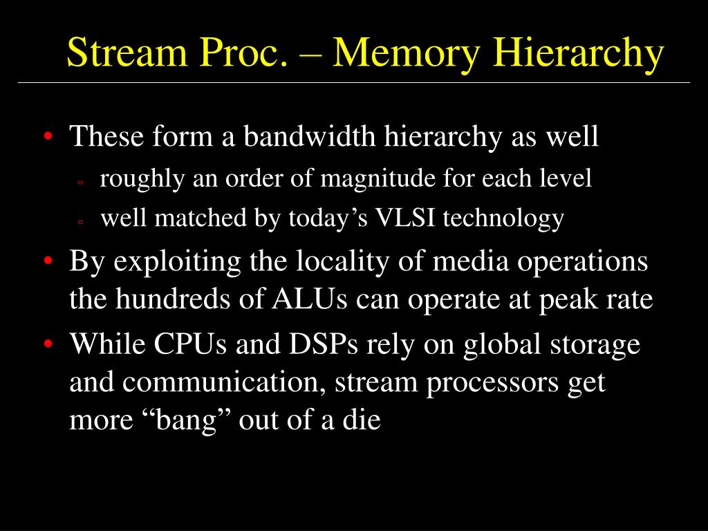 Stream Proc. – Memory Hierarchy • These form a bandwidth hierarchy as well • roughly an order of magnitude for each level • well matched by today’s VLSI technology • By exploiting the locality of media operations the hundreds of ALUs can operate at peak rate • While CPUs and DSPs rely on global storage and communication, stream processors get more “bang” out of a die