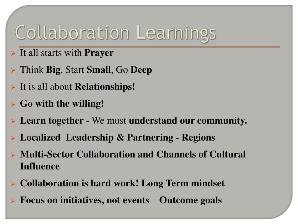Collaboration Learnings • It all starts with Prayer • Think Big, Start Small, Go Deep • It is all about Relationships! • Go with the willing! • Learn together - We must understand our community. • Localized Leadership & Partnering - Regions • Multi-Sector Collaboration and Channels of Cultural Influence • Collaboration is hard work! Long Term mindset • Focus on initiatives, not events – Outcome goals