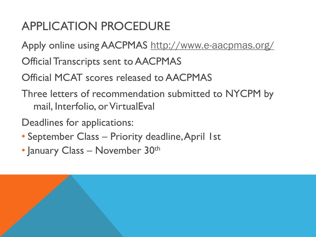 Application Procedure • Apply online using AACPMAS http://www.e-aacpmas.org/ • Official Transcripts sent to AACPMAS • Official MCAT scores released to AACPMAS • Three letters of recommendation submitted to NYCPM by mail, Interfolio, or VirtualEval • Deadlines for applications: • September Class – Priority deadline, April 1st • January Class – November 30th
