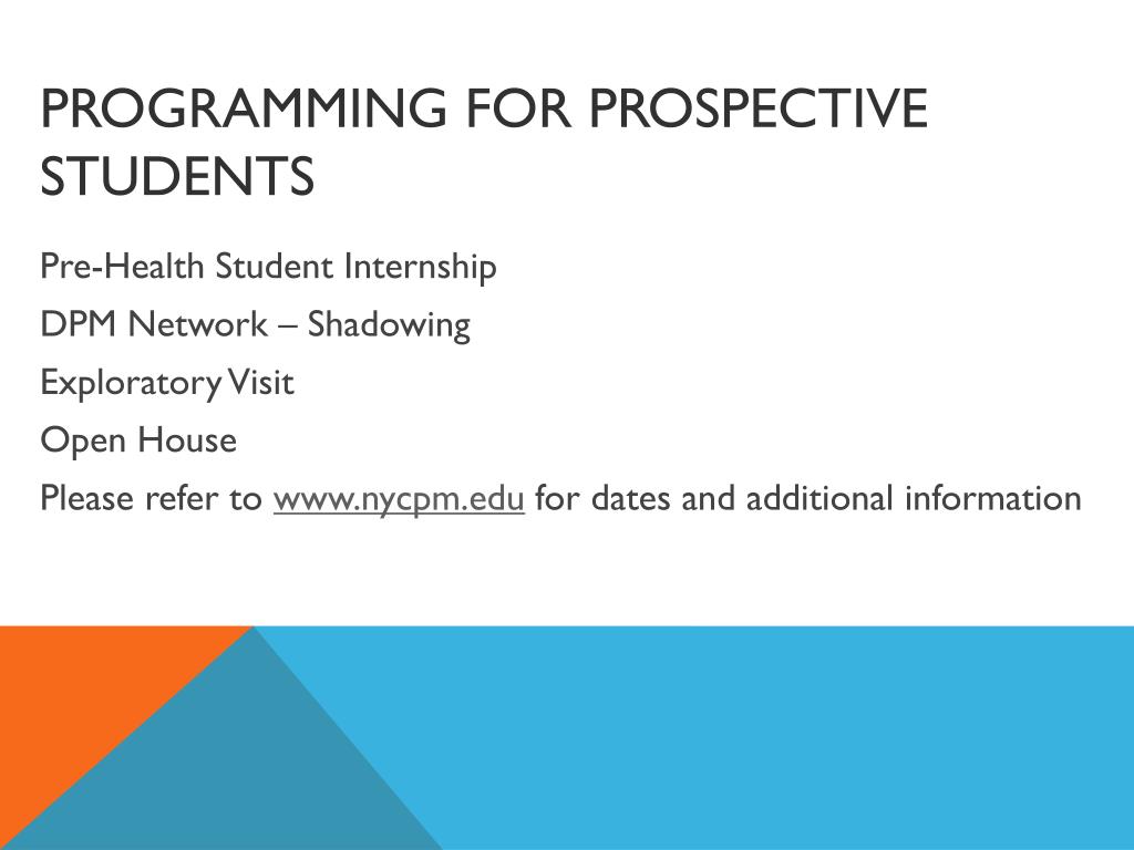 Programming for Prospective Students • Pre-Health Student Internship • DPM Network – Shadowing • Exploratory Visit • Open House Please refer to www.nycpm.edu for dates and additional information