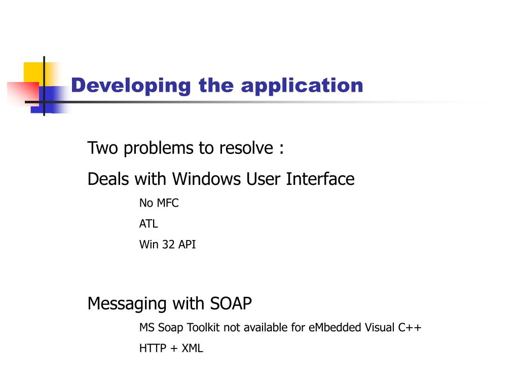 Developing the application Two problems to resolve : Deals with Windows User Interface No MFC ATL Win 32 API Messaging with SOAP MS Soap Toolkit not available for eMbedded Visual C++ HTTP + XML