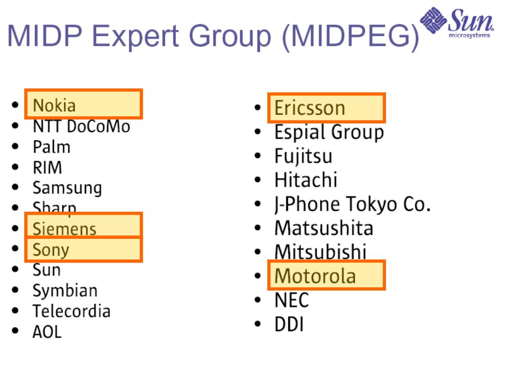 SDK’s • Beta Release of the J2ME Wireless Toolkit 2.1 (WTK21) • Sprint PCS Java Wireless Toolkit 1.0.3_01 • Sony Ericsson SDK 1.2 • Siemens Mobility Toolkits (SMTK) for Java™ • Motorola SDK v4.0 for J2ME • Nokia Developer's Suite for J2ME(TM) 2.0 (2.6.2003) • Impronto Developer Kit for Linux