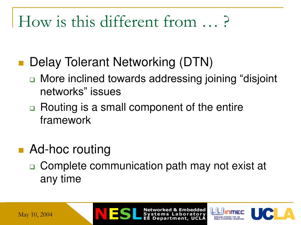 How is this different from … ? • Delay Tolerant Networking (DTN) • More inclined towards addressing joining “disjoint networks” issues • Routing is a small component of the entire framework • Ad-hoc routing • Complete communication path may not exist at any time